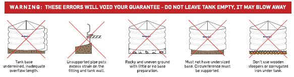 - Tank must be secured or water filled to 25mm to prevent blow-away (no responsibility taken for tanks being damaged in this manner).